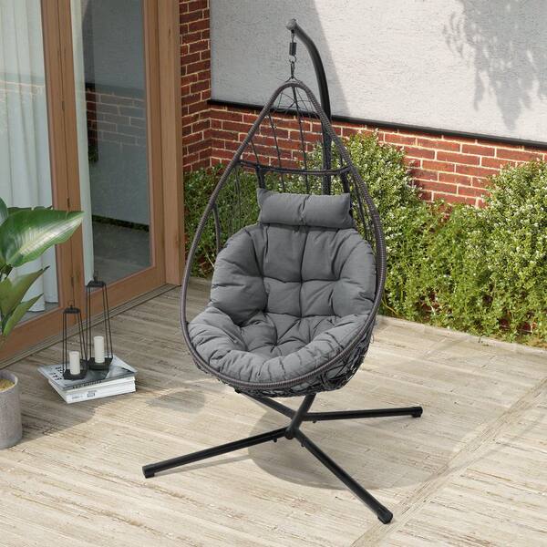 Metal Frame PE Rattan Egg Chair Porch Swing with Gray Cushion