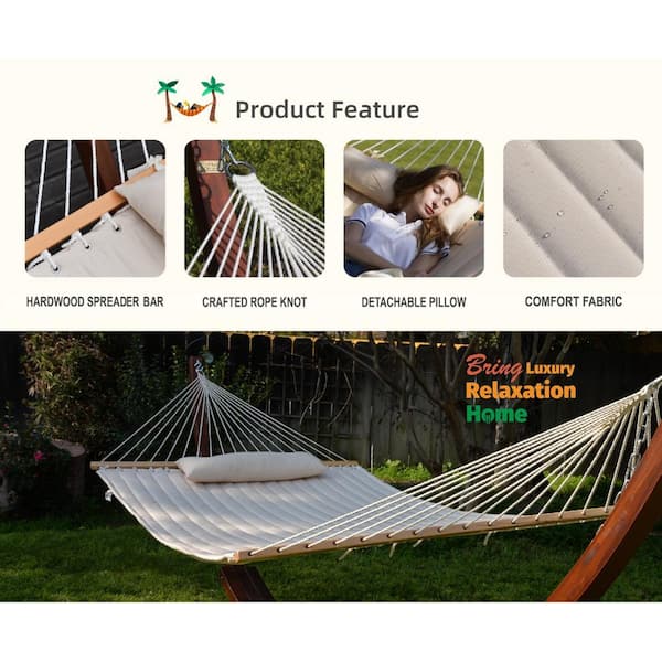 12 ft. 2-Person Hammock, Double Quilted Fabric Hammock with Spreader Bars, Pillow, 450 lbs Weight Capacity in Beige