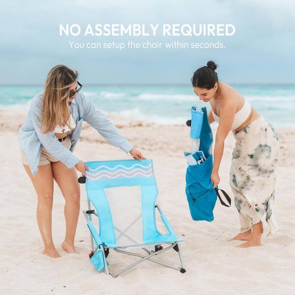 15.3 in. x 20 in. x 28 in. Portable Blue Metal Beach Chair with Umbrella Hold Cup and Storage Bag