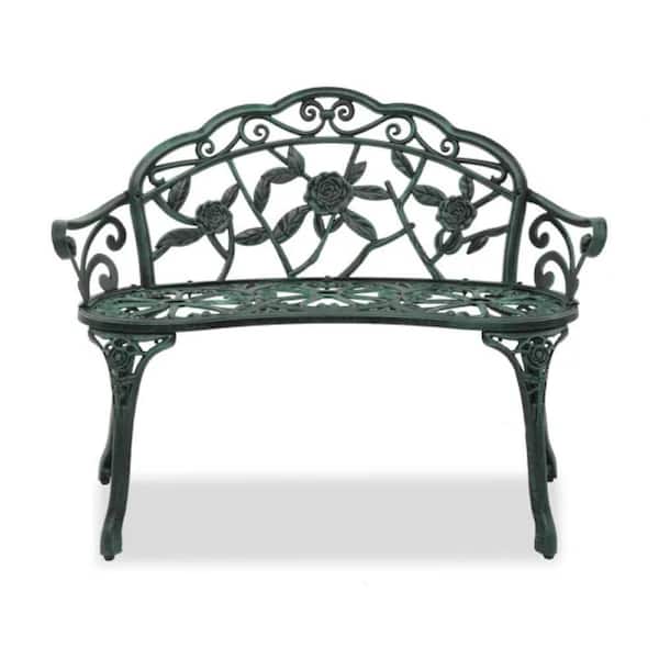 2-Person 38.5 in. Cast Aluminum Outdoor Patio Bench, Porch Chair with Curved Legs Elegant Rose Pattern in Antique Green