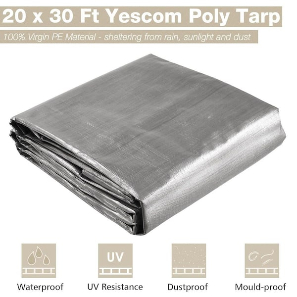 20 ft. x 30 ft. Poly Tarp Cover with 14Mil Thick, All-Weather Protection, Reinforced Edges and Grommets, Silver Black