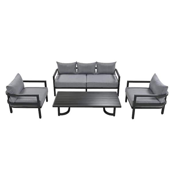 4-Piece Modern Curved Design Metal Outdoor Sectional Set, Waterproof, Anti-Rust and Anti-UV with Light Gray Cushions