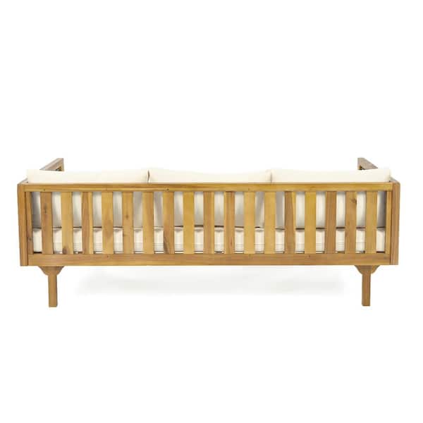 Teak Wood Outdoor Day Bed with Beige Cushion and Rattan Arms 3-Seaters