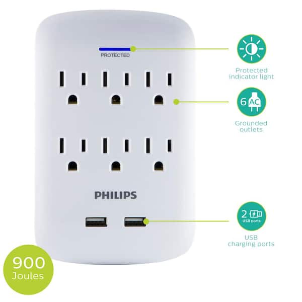 6-Outlet 900J Surge Protector Outlet Extender with 2 USB Hub, White (2-Pack)