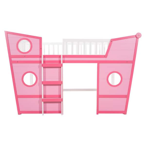 Pink Full Size Boat Shape Loft Bed with Ladder and Guardrail, Boat Design Wood Loft Bed Frame for Kids Boys Girls