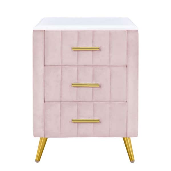 Pink Wood Metal Outdoor Side Table with 3 Drawers, Upholstered Wooden Nightstand, Handles Marbling Worktop