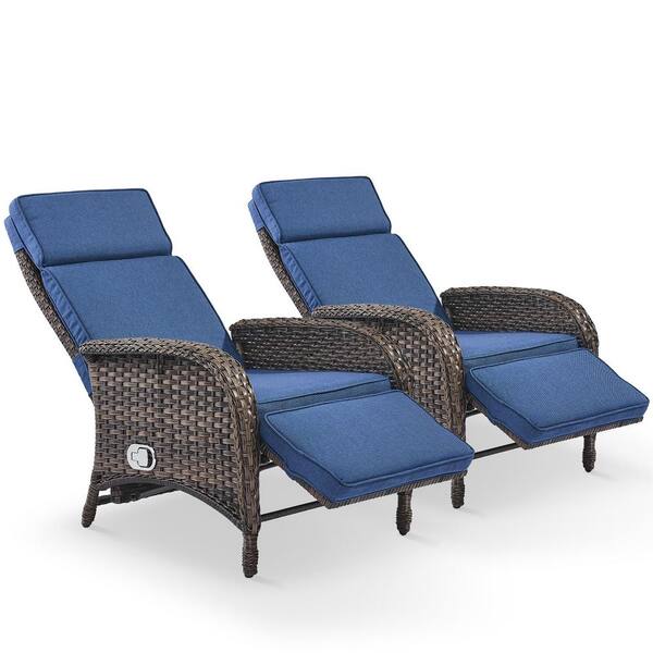 2-Pack Brown Wicker Outdoor Pneumatic Pump Gravity Adjustable Recliner for Patio with CushionGuard Blue Cushions