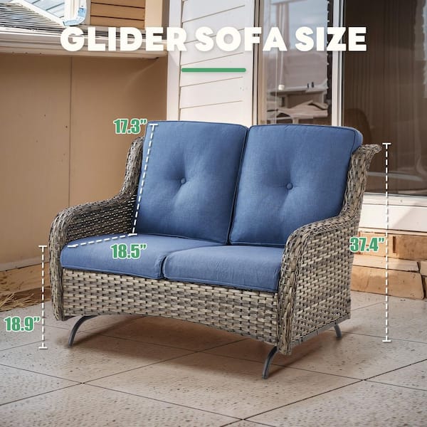 2-Person Wicker Outdoor Patio Glider Couch with Deep Seating and Cushions, Suitable for Porch Deck Balcony (Gray/Blue)