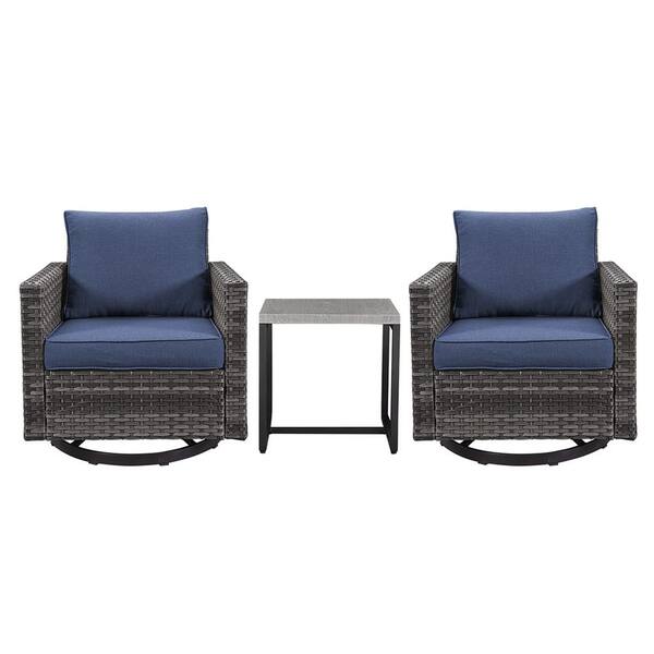 3-Piece Gray Wicker Patio Conversation Deep Seating Set with Blue Cushions Swivel Rocking Chairs