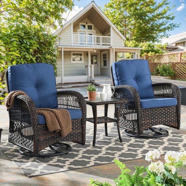 3-Piece Openwork Weaving Wicker Patio Conversation Swivel Rocking Chairs Set with Cushions and Coffee Table
