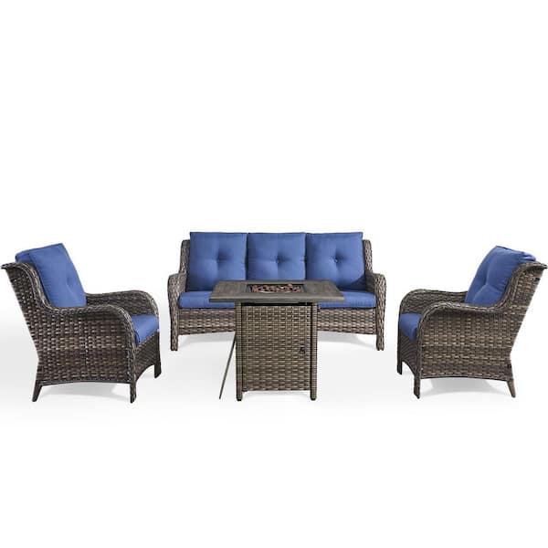 4-Piece Fire Pit Table Patio Sets Wicker Patio Conversation Set with Lounge Chair Blue Cushions