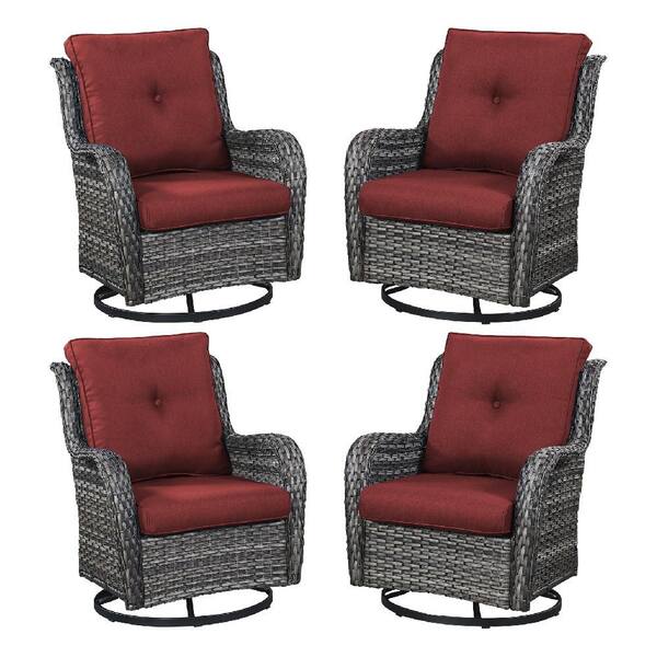 4-Piece Set Outdoor Swivel Gray Wicker Outdoor Rocking Chair with CushionGuard Red Cushions