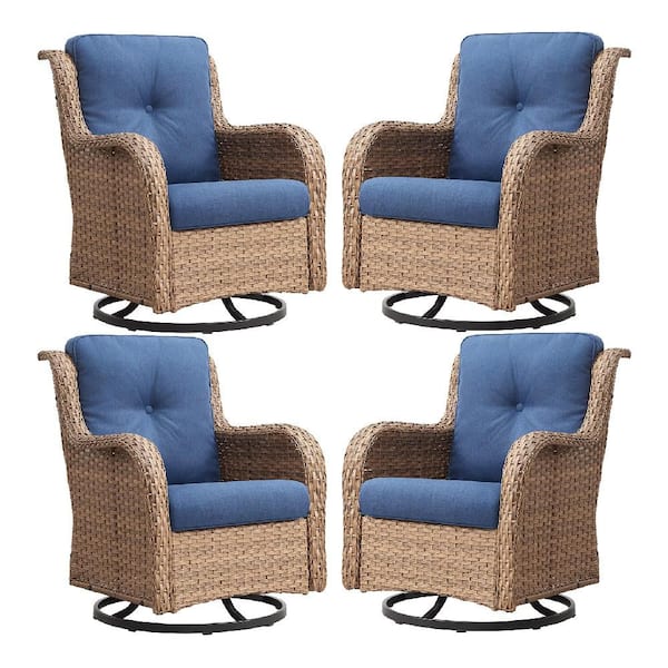 4-Piece Set Outdoor Swivel Yellow Wicker Outdoor Rocking Chair with CushionGuard Blue Cushions