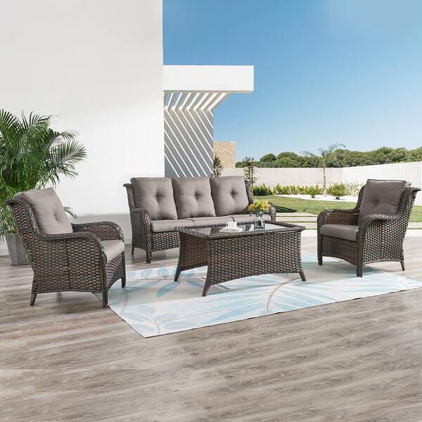 4-Piece Wicker Outdoor Patio Seating Conversation Set Sectional Sofa Glass Coffee Table with Gray Cushions