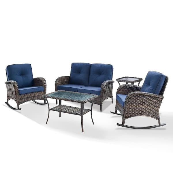 5-Piece Brown Wicker Patio Conversation Set with Blue Cushions and Loveseat Side Table Flat Handrail Rocking Chairs