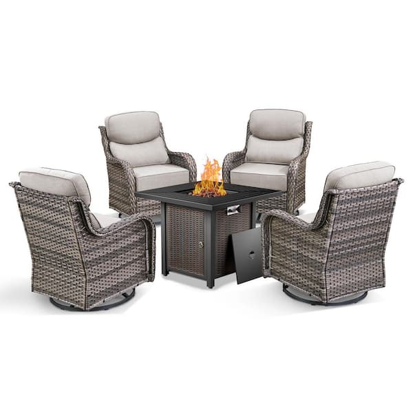 5-Piece Wicker Outdoor Patio Fire Pit Set with CushionGuard Beige Cushions
