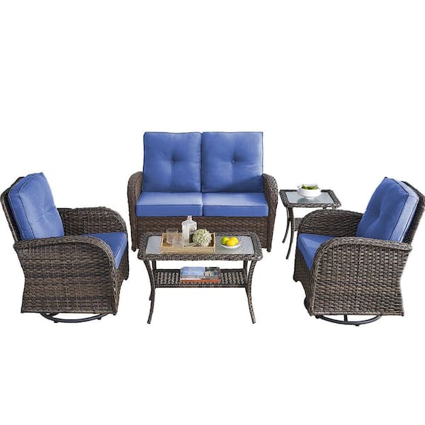 5-Piece Wicker Patio Conversation Set with Blue Cushions
