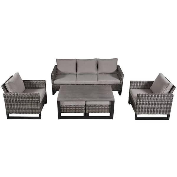 6-Piece All Weater Wicker Outdoor Patio Conversation Sectional Sofa Set with Tea Table, Gray Cushions and Ottomans Set
