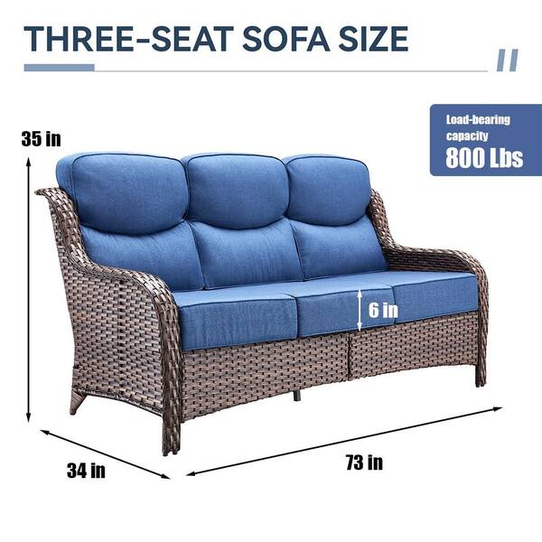 6 in Thicken 3-Seat Wicker Outdoor Couch Patio Sofa with Blue Cushion