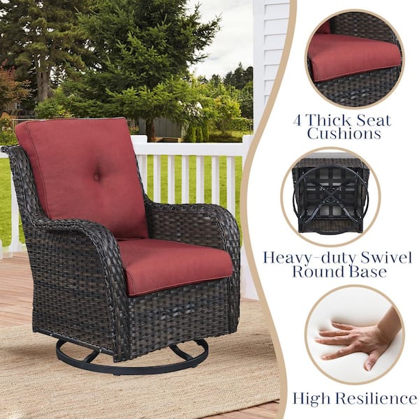 Brown 3-Piece Wicker Patio Conversation Deep Seating Set with Red Cushions All-Weather Swivel Rocking Chairs