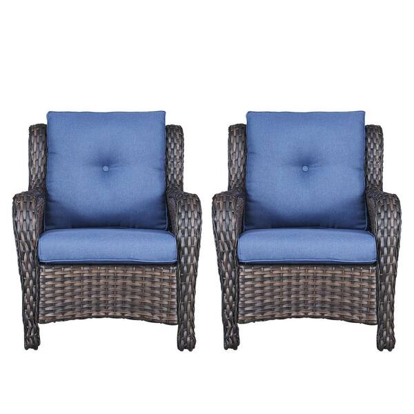 Brown Wicker Outdoor Patio Lounge Chair with CushionGuard Blue Cushions (2-Pack)