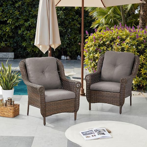 Chrysanthemum Armrest Series 2-Pack Outdoor Brown Wicker Outdoor Lounge Chair with CushionGuard Gray Cushions