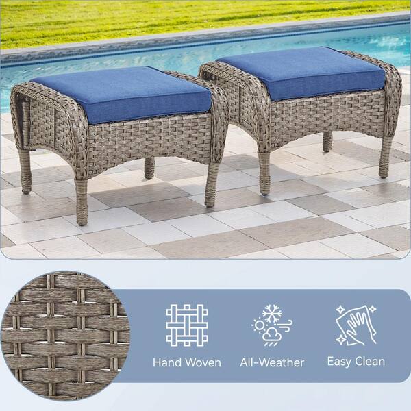 Flat Armrest Series Gray Wicker Outdoor Patio Ottoman with CushionGuard Blue Cushions (2-Pack)