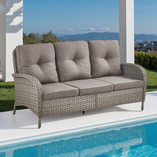 Flat armrest series 3 Seat Gray Wicker Outdoor Patio Sofa Couch with Deep Seating and Gray Cushions