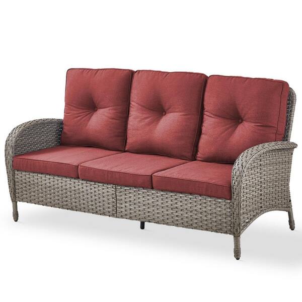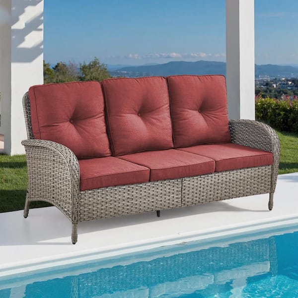Flat armrest series 3 Seat Gray Wicker Outdoor Patio Sofa Couch with Deep Seating and Red Cushions