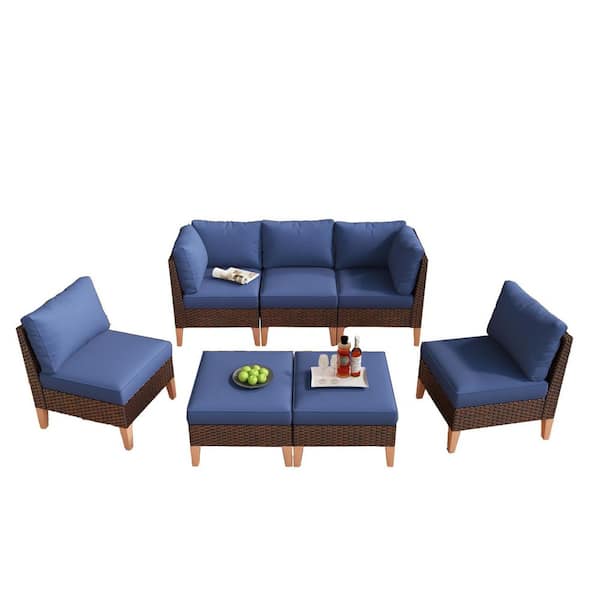 Modular Sofa Collection - 7 Piece Brown Wicker Outdoor Conversation Set Sectional with CushionGuard Blue Cushions
