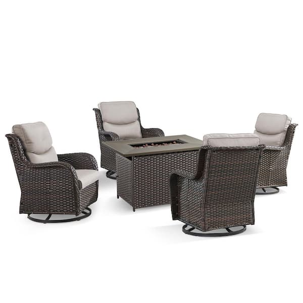 Quanxer Brown 5-Piece Wicker Patio Rectangle Fire Pit Conversation Set with Beige Cushions and Swivel Chairs
