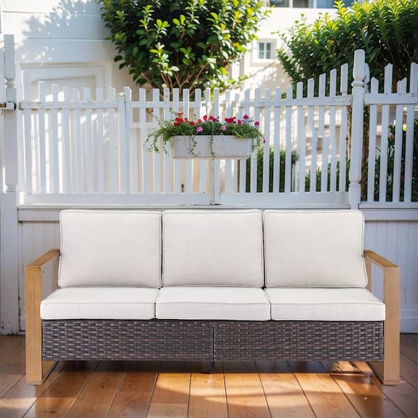 Rectangular Framed Armrest 3-Seat Brown Wicker Outdoor Patio Couch Sofa with Deep Seating Beige Fade-Resistant Cushion