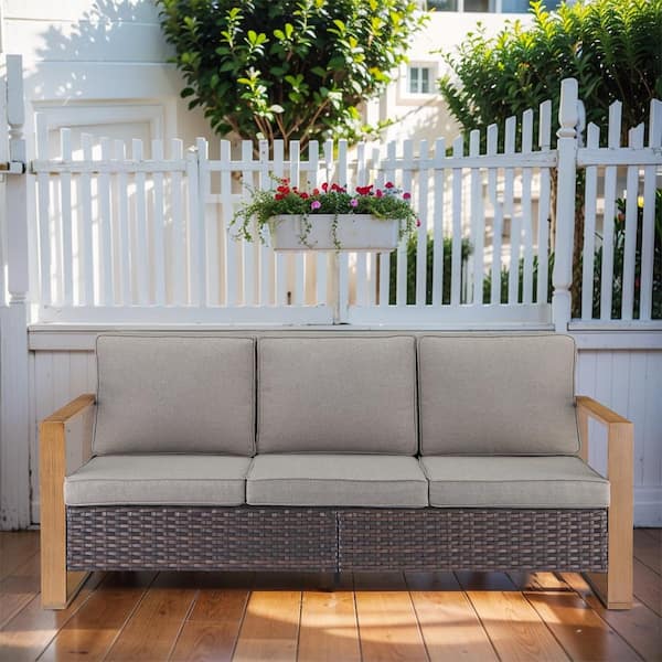 Rectangular Framed Armrest 3 Seat Brown Wicker Outdoor Patio Sofa Couch with Deep Seating & Gray Fade-Resistant Cushions