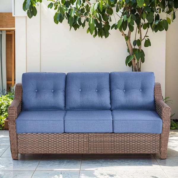 Round Side Series 3 Seat Wicker Outdoor Patio Sofa Couch with Deep Seating and Blue Cushions