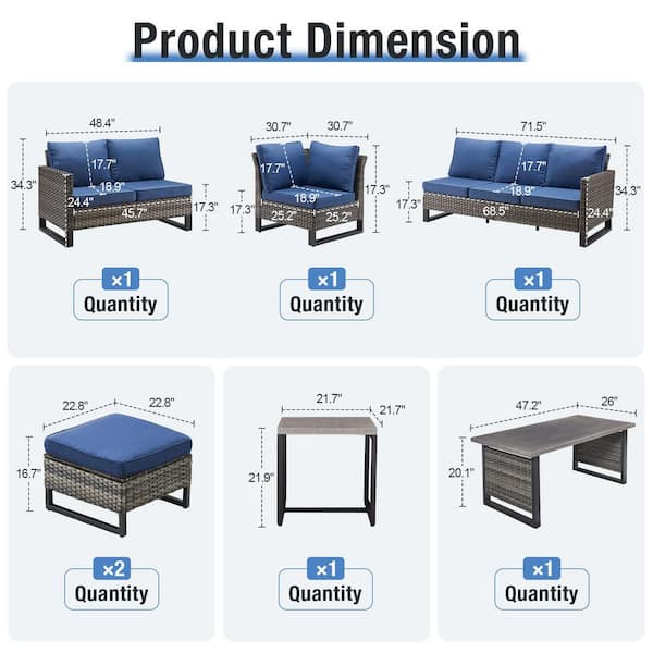 U-Series 7-Piece Outdoor Gray Wicker Sofa PE Rattan Wicker Patio Conversation Set with Cushion Guard Cushions (Blue)