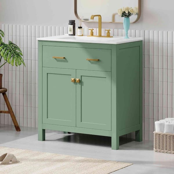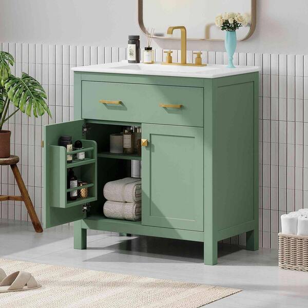 30 in. W Single Sink Freestanding Bath Vanity in Green with White Ceramic Top, 2 Doors and a Shelf