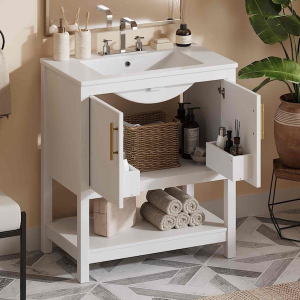 30 in. W Single Sink Freestanding Bath Vanity in White with White Ceramic Top, Open Shelf and 2 Doors