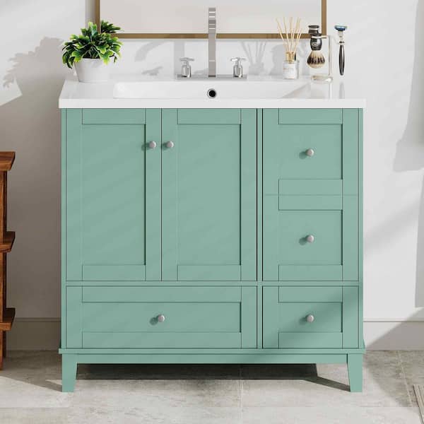36 in. W Single Sink Bath Vanity in Green with White Solid Surface Top, USB Charging Ports, 2-Doors and 3-Drawers