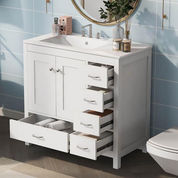 36 in. W Single Sink Freestanding Bath Vanity in White with White Ceramic Top, 2 Soft Close Doors and 5 Drawers