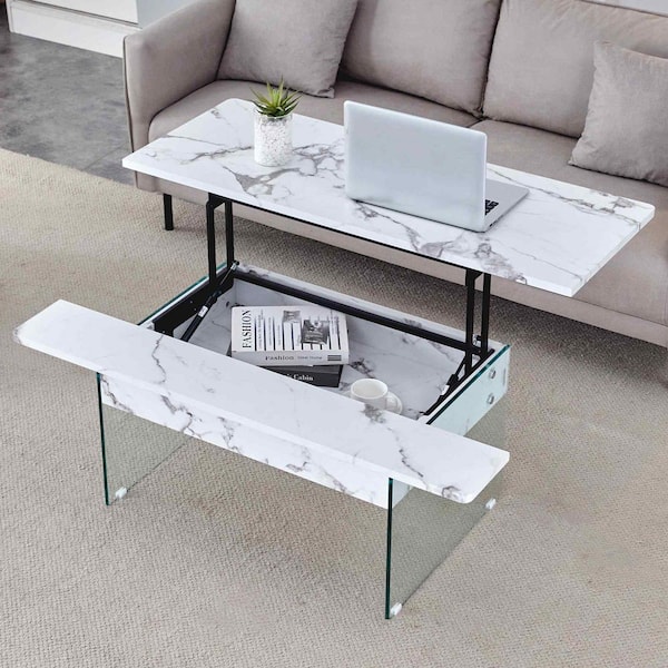 43.3 in. Transparent, White Rectangle Glass Coffee Table with Multifunctional Lift Top
