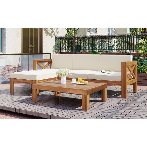 5-Piece Patio Wood Outdoor Backyard Sectional Sofa Seating Group Set with Beige Cushions, Natural Finish