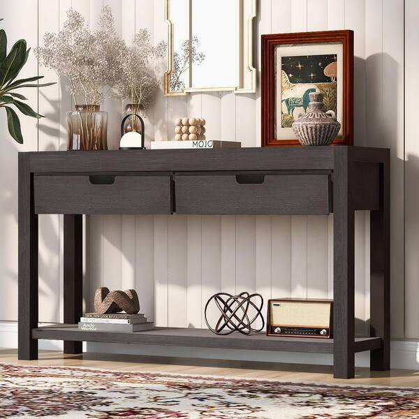 55.1 in. Antique brown Rectangle Wood Console Table with 2-Drawers and 1-Shelf