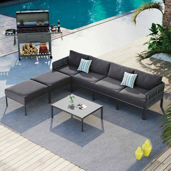 6-Piece Metal Frame Outdoor Patio Conversation Set with Gray Removable Cushions and Pillows