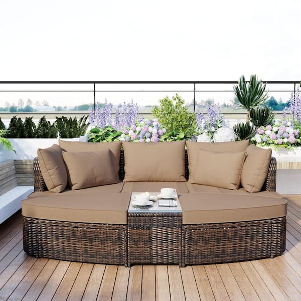 6-Piece Wicker Patio Conversation Set, Outdoor Round Sofa Set with Brown Cushions and Coffee Table
