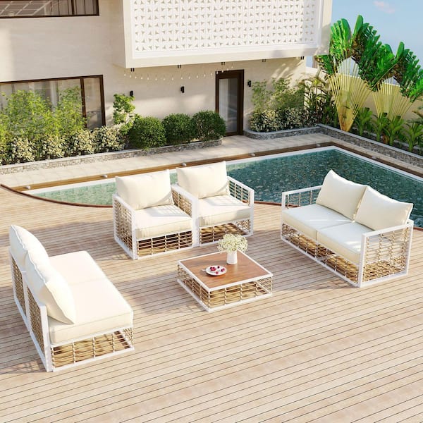 7-Piece White Metal Frame Outdoor Patio Conversation Set with Beige Cushions, Coffee Table and 8 Pillows