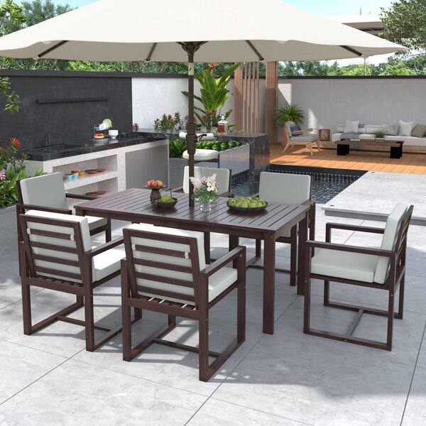 7-Piece Wood Outdoor Dining Set with Removable Light Beige Gray Cushions