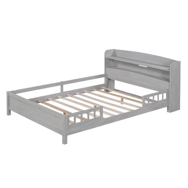 Antique Gray Wood Frame Full Size Platform Bed with Built-in LED Light,Storage Headboard and Guardrail
