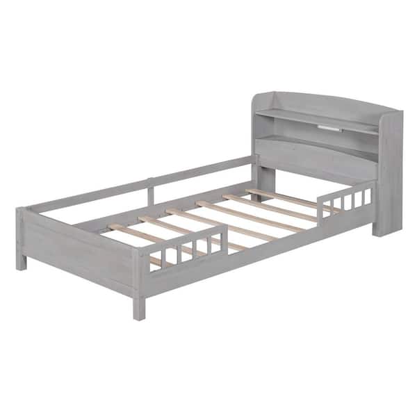 Antique Gray Wood Frame Twin Size Platform Bed with Built-in LED Light, Storage Headboard and Guardrail