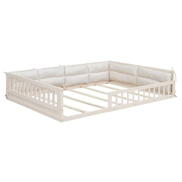 Beige Wood Frame Full Size Platform Bed with Guardrail and Pillow