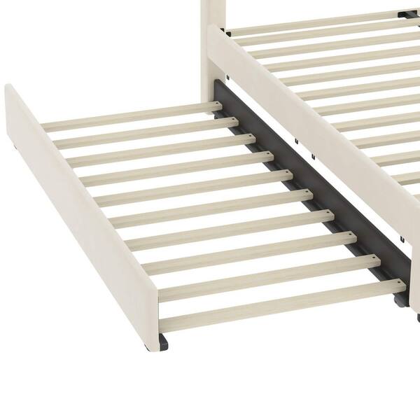 Beige Wood Frame Queen Size Platform Bed with Trundle Bed and 2 Drawers, Gold Decoration